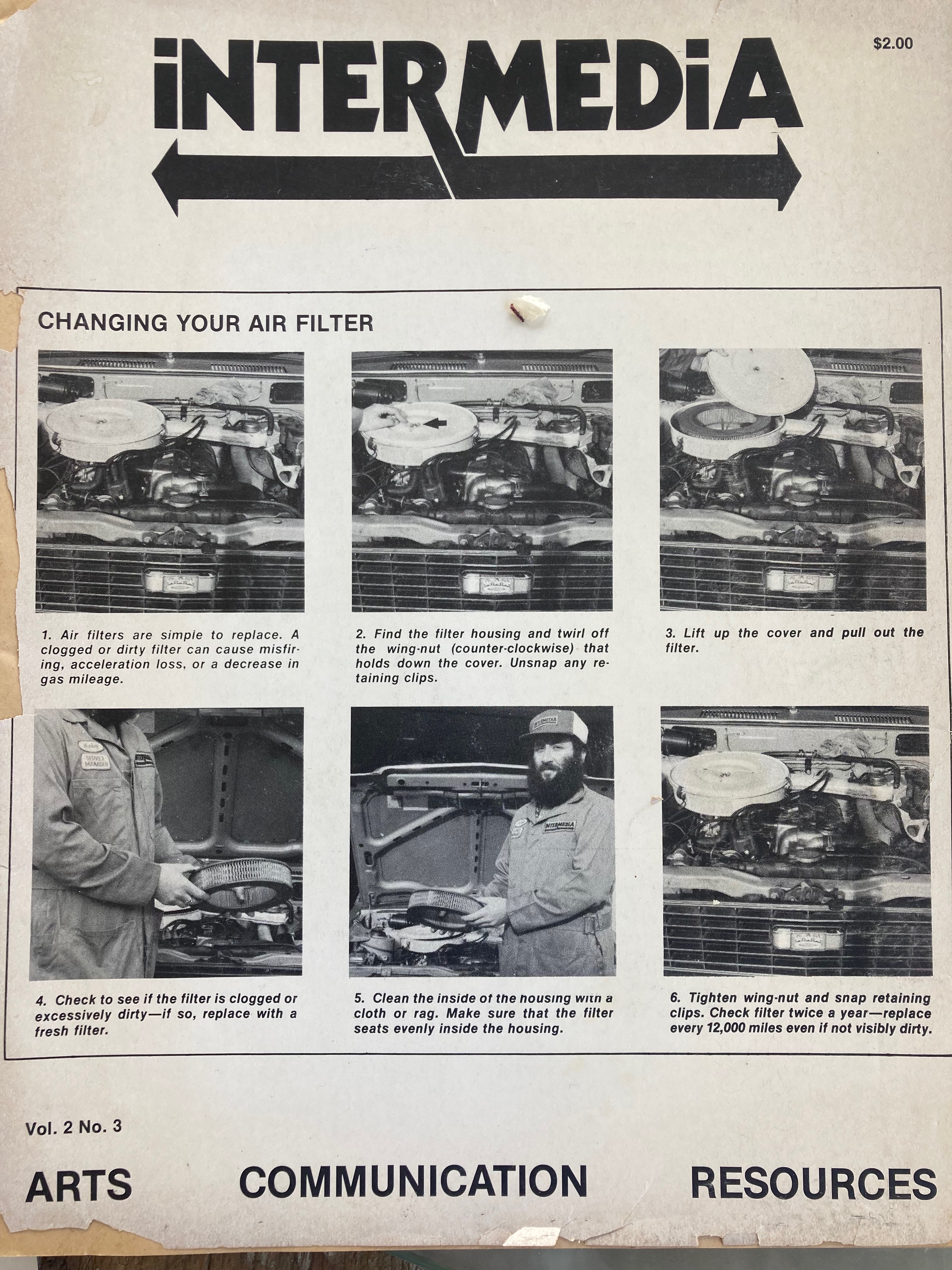 In order to support this publication, Harley Lond worked at an auto parts store. On the cover of issue no. 7 of INTERMEDIA, he played the role auto maintenance mentor to those who wanted to learn the basics of automobile upkeep.